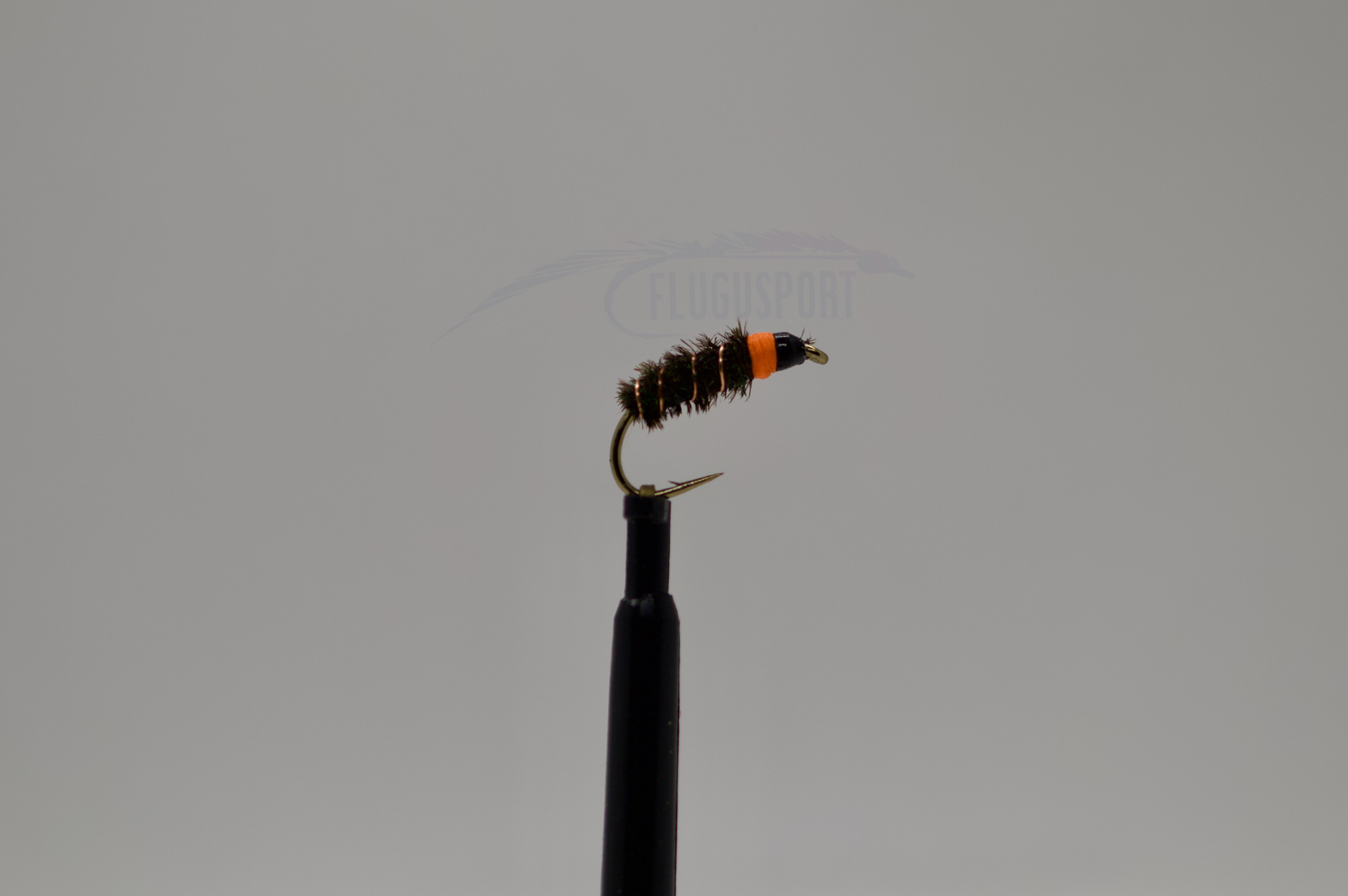 Hotspotið eru úr Tag Thread – F. Hot Orange. Hann er mjög næmur fyrir UV-ljósi og bregst sterklega við því. Hann er mjög hentugur í margar flugur sem eru með Hot Spot.